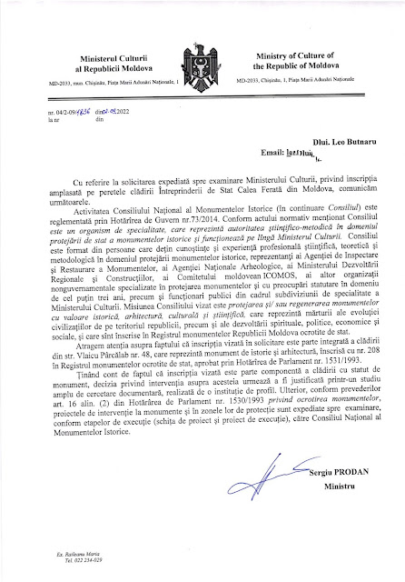 Ei bine, pentru ca să vă dați seama de „promptitudinea, urgența, operativitate, neamânarea” (ziceți-i cum vreți) birocraților prezentului nostru nu fac decât să reproduc aici un răspuns referitor la o mizerabilă placă de la intrarea în sediul CFM (Chișinău). (Le scriam în august 2022, mirat că, până la acea vreme, „noul” minister al culturii nu rezolvase problema; trecuse suficient timp de la întronarea sa, nu?) Ministrul mi-a răspuns ce vedeți aici. Însă realitatea e că, din august 2022 încoace, ca și până atunci, placa respectivă se află bine mersi la locul vechi. Dar de cât timp aveți nevoie, domnilor? În caz contrar, miroase nu doar a birocrație, ci și a indiferență în amestec cu sabotajul. A lipsă de patriotism, dacă vreți.